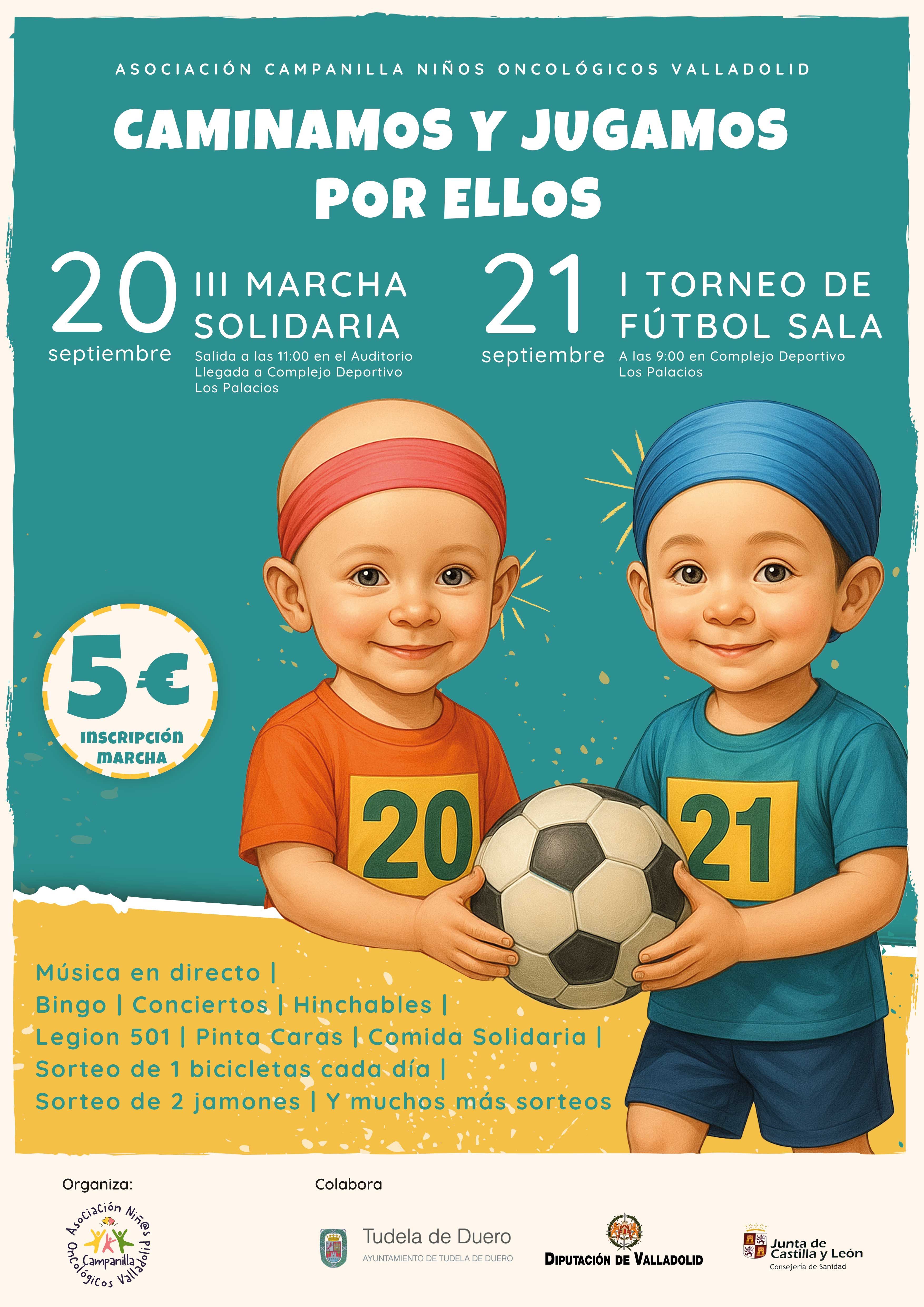 Un año más, desde la Asociación Campanilla seguimos caminando juntos para llenar de esperanza y sonrisas los días más difíciles de los niños y sus familias. Este 2025 celebramos con muchísima ilusión la III Marcha Solidaria de Tudela de Duero y, como gran novedad, el I Torneo Solidario de Fútbol Sala, que convertirán el fin de semana del 20 y 21 de septiembre en dos días de deporte, convivencia, música y solidaridad.
