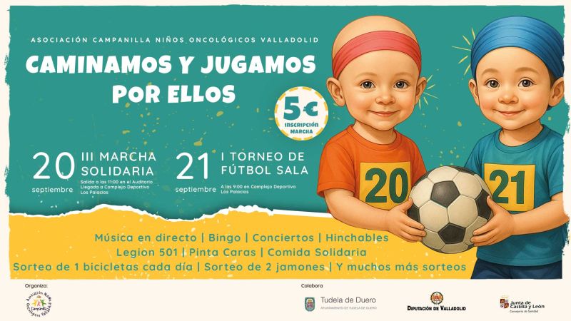 Un año más, desde la Asociación Campanilla seguimos caminando juntos para llenar de esperanza y sonrisas los días más difíciles de los niños y sus familias. Este 2025 celebramos con muchísima ilusión la III Marcha Solidaria de Tudela de Duero y, como gran novedad, el I Torneo Solidario de Fútbol Sala, que convertirán el fin de semana del 20 y 21 de septiembre en dos días de deporte, convivencia, música y solidaridad.